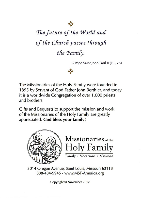 Your donation to the Missionaries of the Holy Family benefits the work of our priests and brothers in pastorally caring for the Family. The Missionaries of the Holy Family is a 501(c)(3) non-profit organization, and your gift is tax deductible. Your privacy is important to us, so we do not sell, share, or trade your personal information.